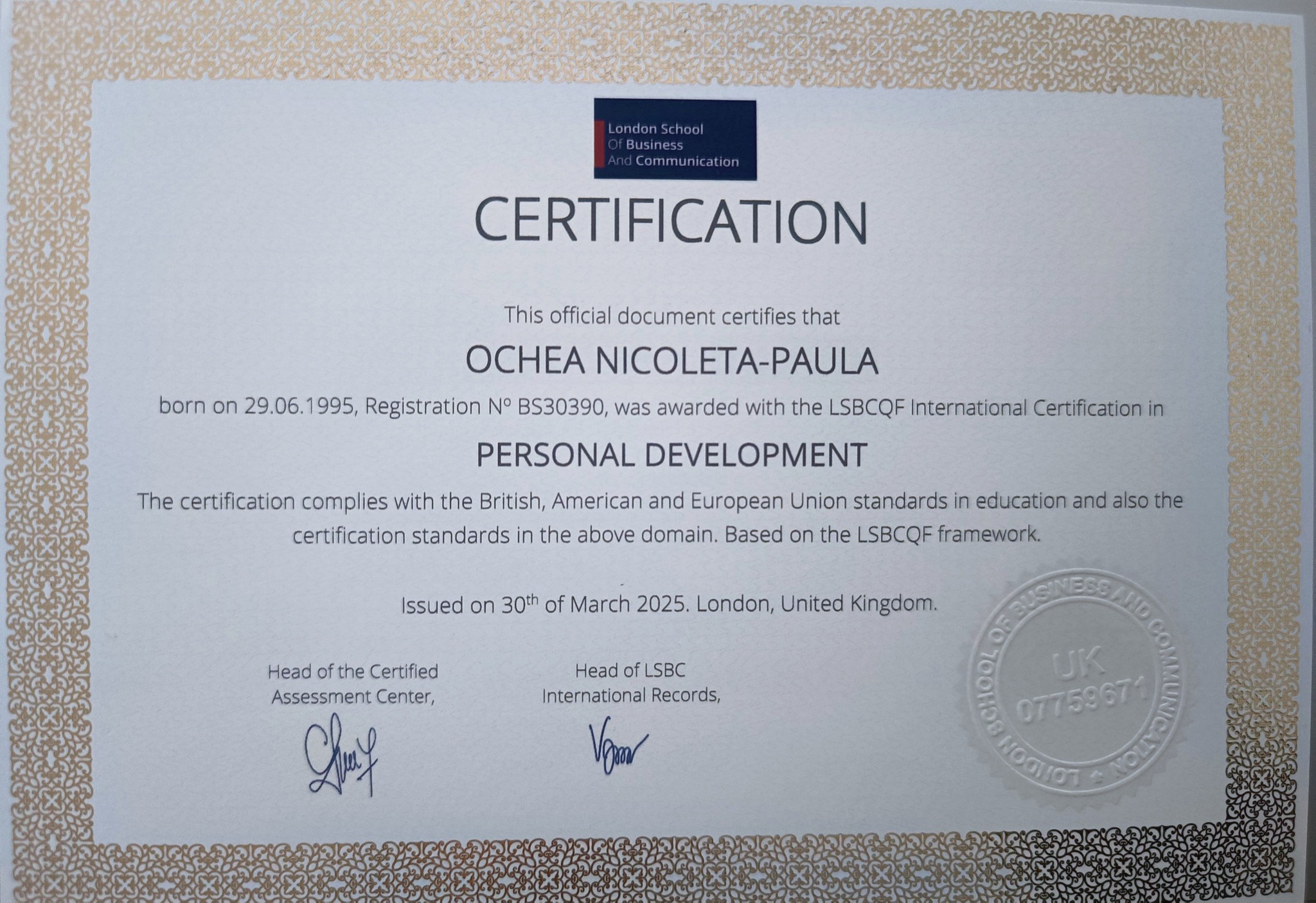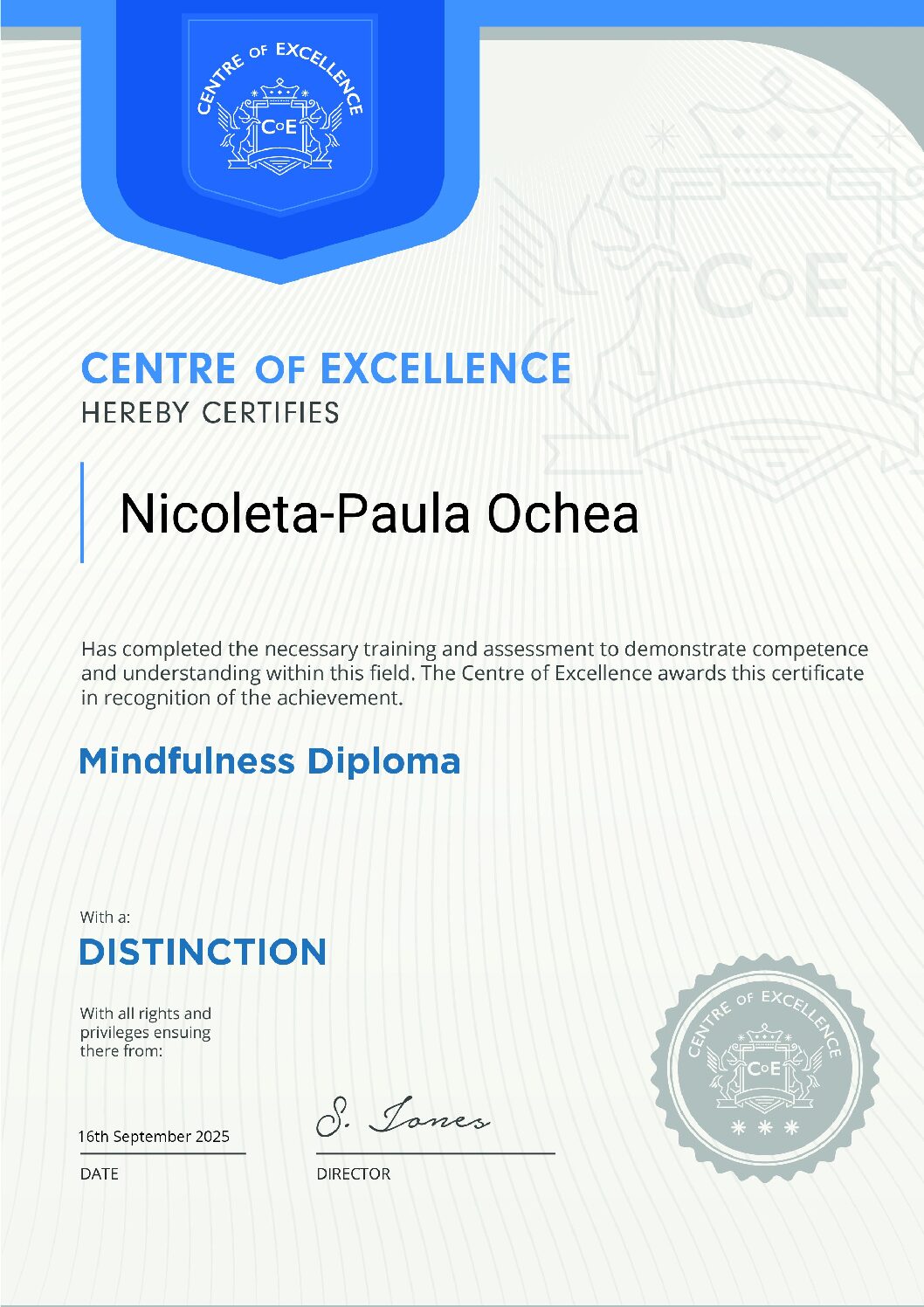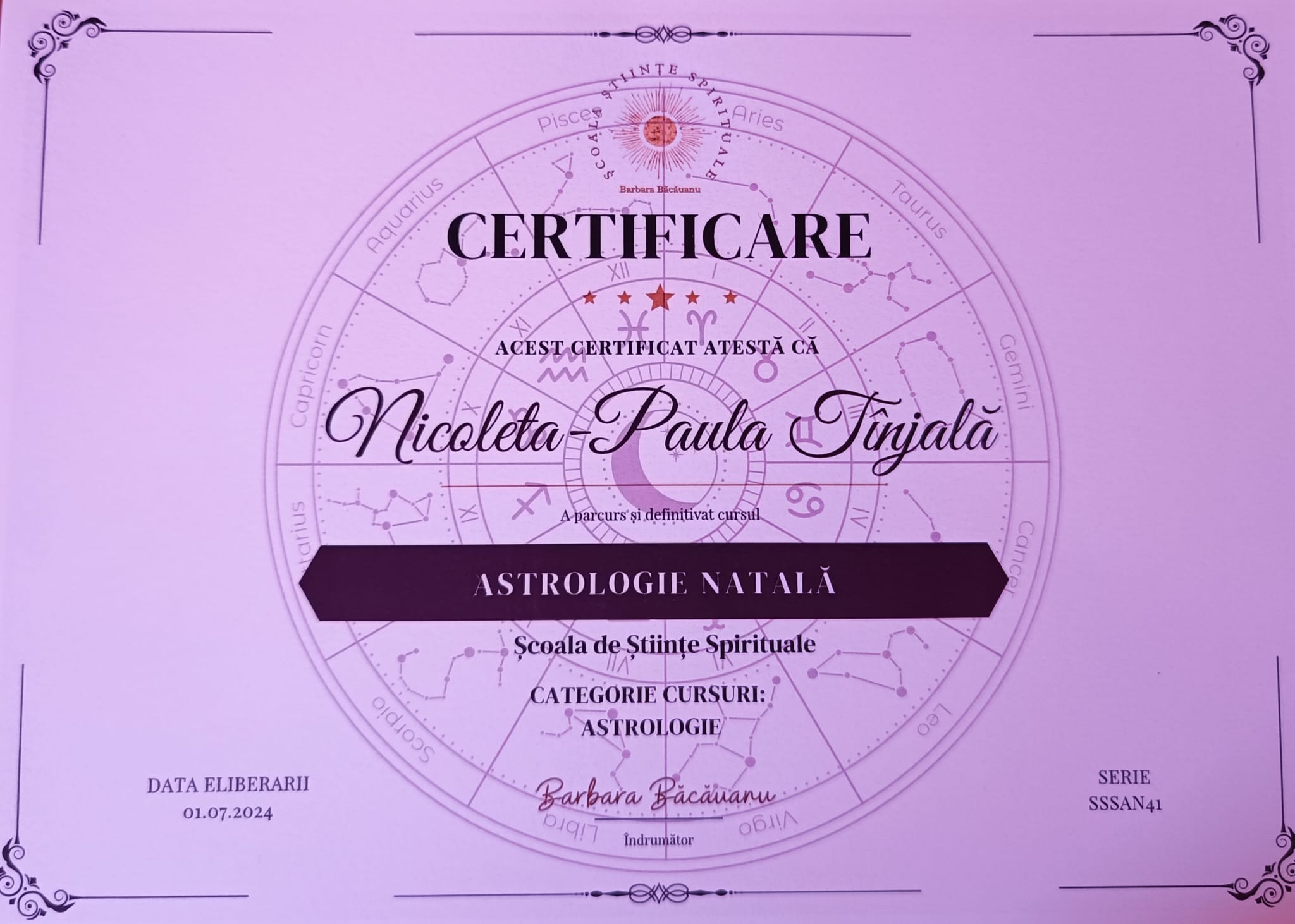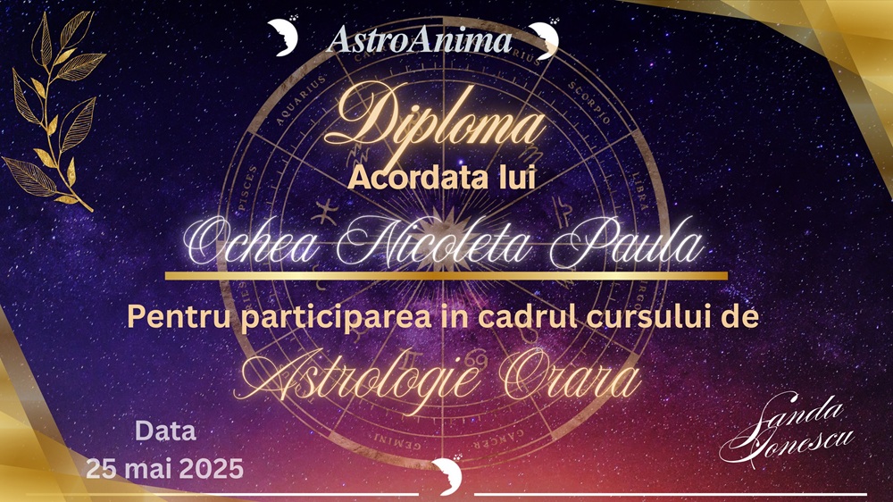 Dețin titulatura de Astrolog Specialist și am aprofundat ramuri precum Astrologia Natală, Karmică, Relațională și Previzională. De altfel, cursurile în Astrologie vocațională și de business, dar și în Astrologie Mundană și Orară, mi-au extins cunoștințele în domeniu și mi-au permis rafinarea tehnicilor utilizate, oferind o notă în plus de profunzime și claritate analizelor astrologice.